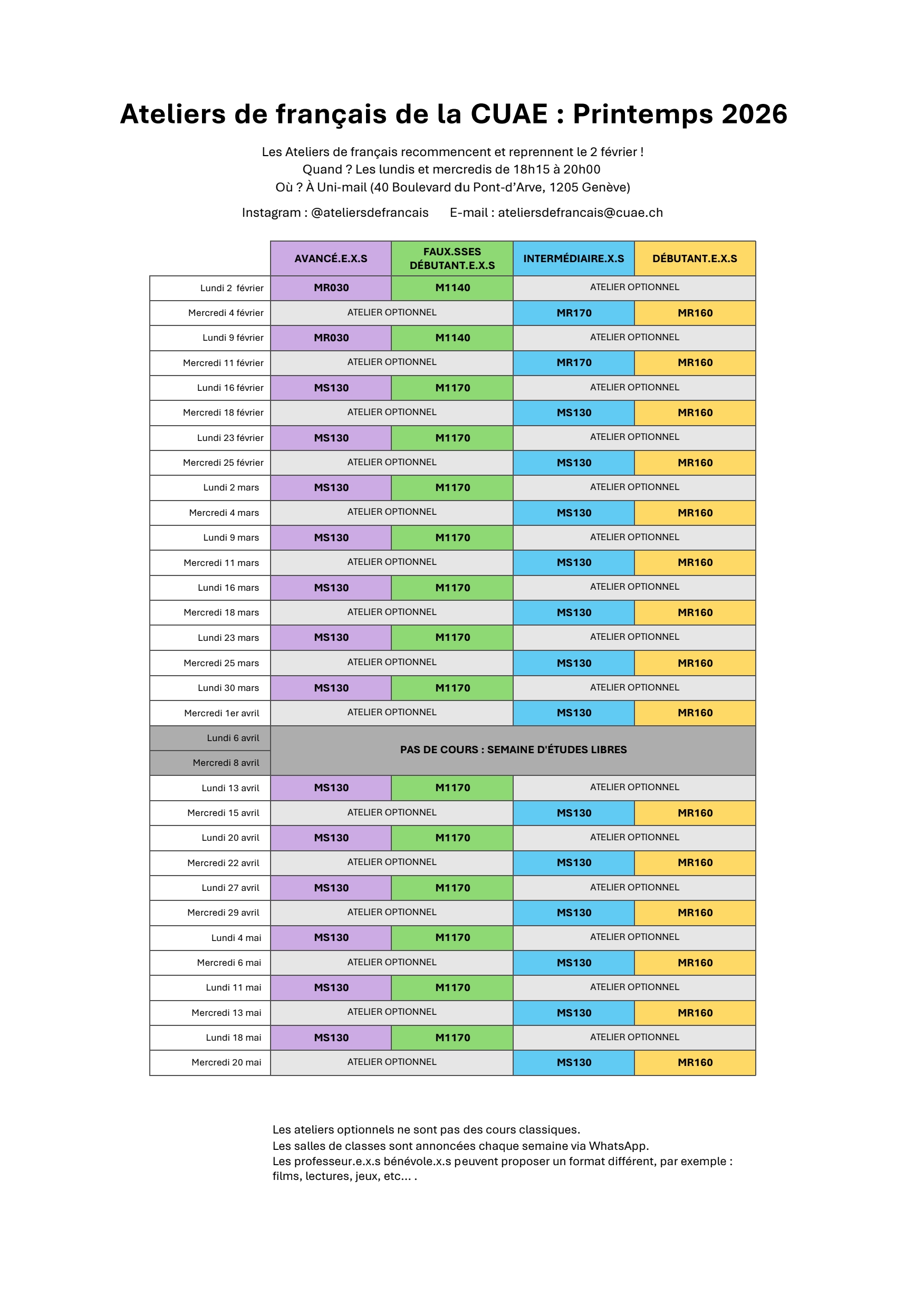 Ce GT poursuit un objectif simple : offrir des ateliers de français aux personnes qui en ont besoin. Des ateliers ont lieu deux fois par semaine (les lundis et les mercredis, de 18h15 à 20h) durant le semestre universitaire grâce à des étudiant.e.x.s motivé.e.x.s à donner de leur temps. Ces ateliers peuvent prendre une forme très différente d’une semaine à l’autre (conversation, français spécifique au domaine d’études, etc.) même si l’échange apparaît comme le dénominateur commun à ce GT. Les dates et lieux des cours peuvent être retrouvés ci-dessous
