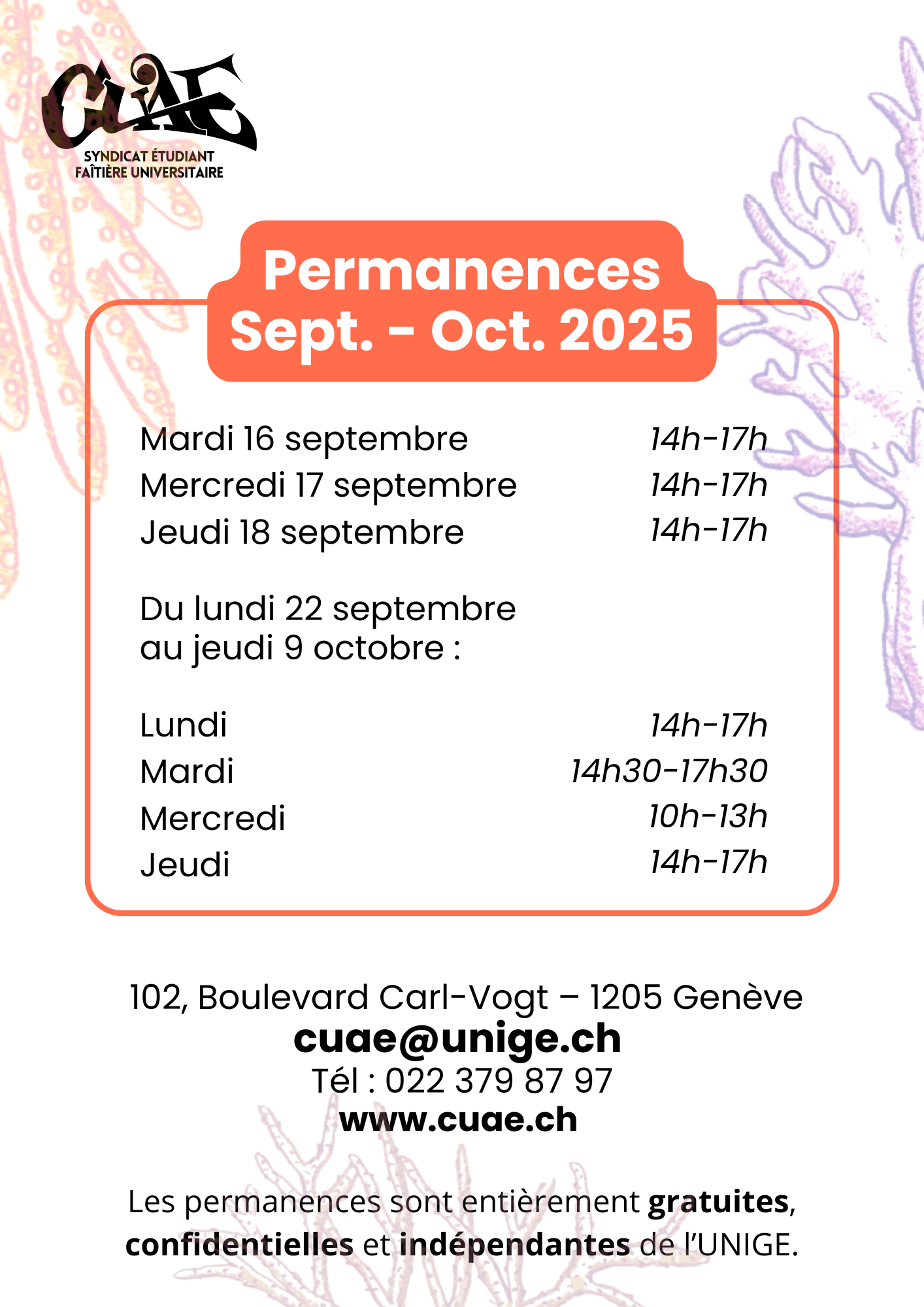 Les permanences de la CUAE sont des permanences juridiques et de soutien destinées aux étudiant.e.x.s ou aux associations. Elles sont gratuites, confidentielles et indépendantes de l’université.