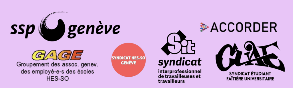 Organisation : SIT, SSP Genève, GAGE, ACCORDER, CUAE, Syndicat HES Genève.